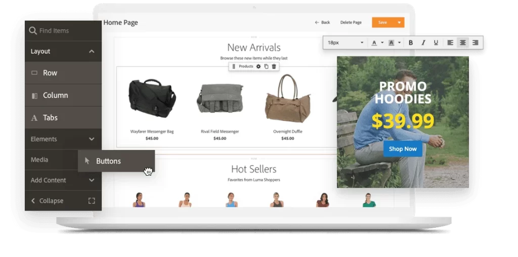 - Page Builder: Build creative pages for your shoppers with images, videos, and banners with its drag-and-drop content management interface. Magento???s intuitive page builder makes management of your site easier than ever before with its features like in-lining editing, reusable dynamic blocks, and ready-to-use templates.