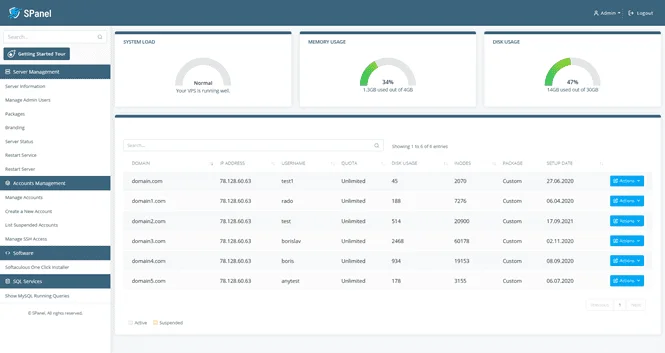 The Admin Interface is the equivalent of cPanel’s WHM. By default, you can access it via the https://[your server’s IP]/spanel/ URL and use it for server maintenance tasks like: