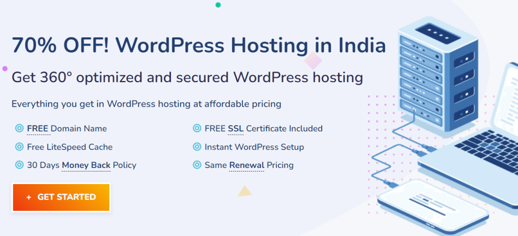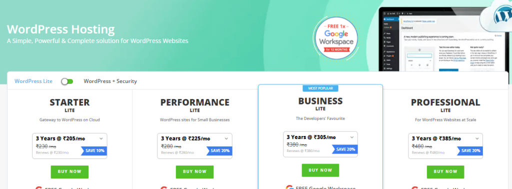 Business WordPress: Rs.299/month offering 100 websites, 200GB SSD Storage, Free SSL, Free Domain, Unlimited Bandwidth, and best optimized for small businesses.