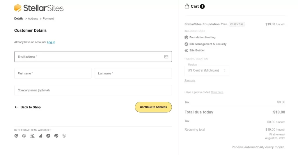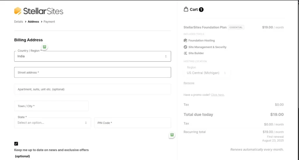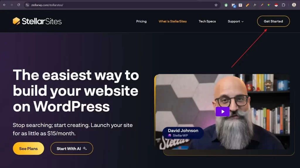 1. Choose your plan – StellarSites usually offers beginner-friendly packages. Pick one that suits your needs and use cases (start with the Essential plan if you are new).