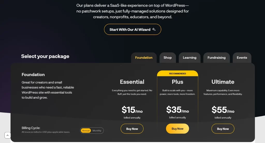 The Ultimate Plan is for people who want the best of everything: speed, flexibility, and performance. This plan can handle big websites or online stores with ease. It has 100GB of storage, 5TB of bandwidth, and premium features like enterprise-grade caching, mega menus, and 8,000 AI writing credits per year. This plan will give you the fastest and smoothest experience if you want to be serious about your online presence or run an eCommerce site.