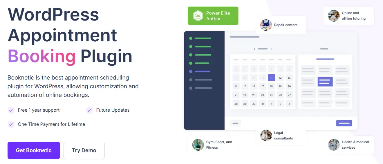 Booknetic is a WordPress Appointment Booking Plugin, that allows customization & automation of online bookings. It is trusted by industry experts. The robust functionalities, user-friendly design, and seamless integration of payment systems in Booknetic enable simple automation of your reservation system online. Booknetic is a versatile appointment booking plugin that serves a variety of industries like gym, sport & fitness, online & offline tutoring, beauty & wellness, independent consultants, repair centers, spa salons, legal consultants, health & medical services, etc. It offers free 6 months of support, future updates, and one-time payment for a lifetime. Get started now at Booknetic, grab maximum discounts, and enjoy!