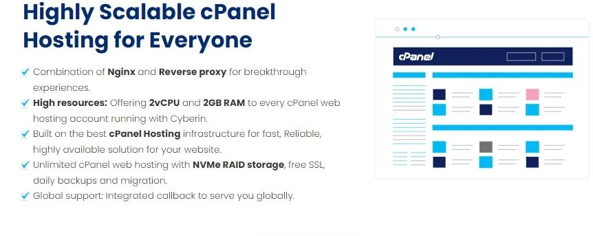 Cyberin provides high-performance cPanel Shared hosting plans at a very low price, which are compatible with all industry-standard applications, and offers free auto SSL, daily backups, a 30-day money-back guarantee, 24/7 server monitoring, and complete customization options.