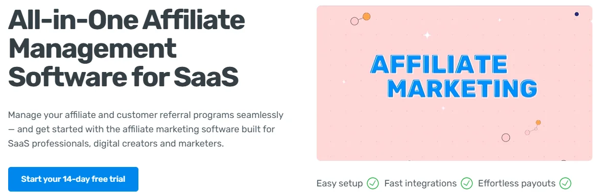 One of the best Affiliate Marketing Software. It includes fast integrations, a user-friendly portal, a simple setup, and effortless payout management.
